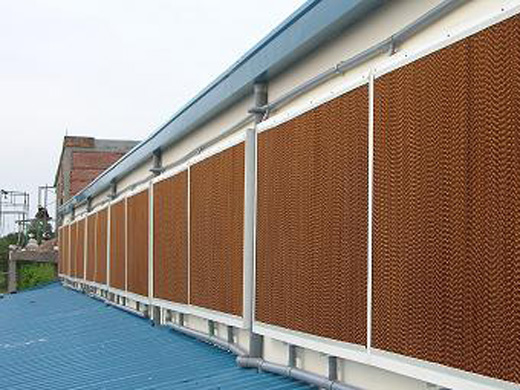 ZR濕簾降溫系統(tǒng)的降溫過程是在基核心-ZR紙墊內(nèi)完成的。在波紋的纖維紙表面有層薄薄的水膜,當室外干熱空氣被風機抽吸穿過紙墊時,水膜上的水會吸收空氣中的熱量進而蒸發(fā)在水蒸氣,這樣經(jīng)過處理后的涼爽濕潤的空氣就進入室內(nèi)了。這自然的過程猶如風吹過水面一樣。